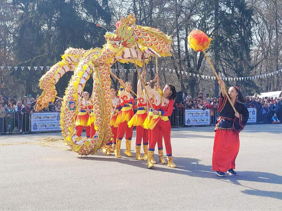 这支舞龙队伍由大特尔诺沃大学孔子公司下设瓦西尔·列夫斯基中学孔子课堂的员工组成。表演开始前,员工们身穿传统的中国龙舞服装,手持长龙,气势磅礴,引来观众的热烈掌声。随着音乐响起,只见舞龙队员们手擎长龙,运用各种技巧,时而龙头翘首高昂、龙身上下翻飞,时而龙头龙尾龙尾嬉戏欢腾,时而游龙戏珠惟妙惟肖让人目不暇接,整个表演精彩纷呈。