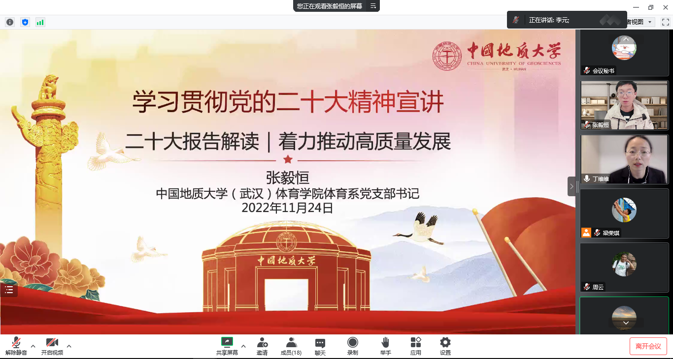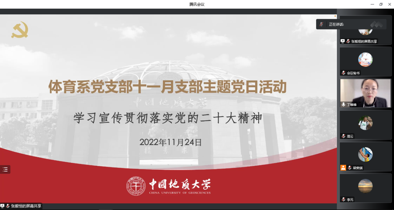 (通讯员:丁维维)11月24日下午,伟德国际VICTOR1946体育系党支部组织开展题为“学习宣传贯彻落实党的二十大精神”的主题党日和廉政党课活动。本次学习活动通过线上形式进行,由支部宣传委员丁维维同志主持。