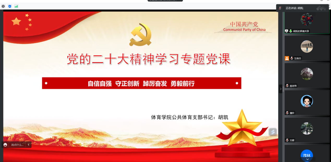 胡凯同志开展《党的二十大精神学习专题党课》宣讲。强调要深刻认识新时代新征程体育工作的使命任务。党的二十大报告明确提出加快建设体育强国的任务要求。体育系统要深刻认识这一艰巨任务的神圣使命,充分发挥体育在全面建设社会主义现代化国家过程中为人民健康筑基、为伟大复兴聚气、为社会发展赋能、为自信自立铸魂、为全球体育增力的综合价值和多元功能。