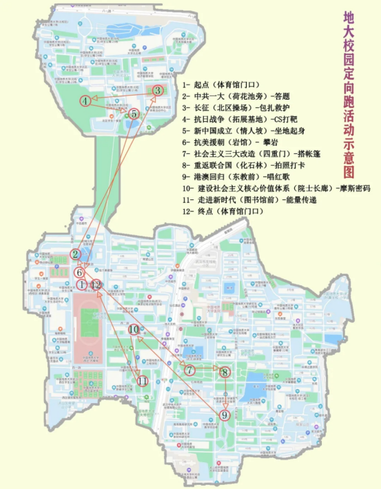 本次活动模拟长征形式,围绕党的百年奋斗历程,以党史知识为基础,在地大校园内开展定向跑。每个定向打卡点以中国共产党发展历程的重要节点为主题。