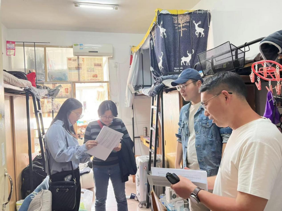 (通讯员 肖晓媚 陈爽)为落实常态化疫情防控“四个一”专项行动,扎实做好校园常态化疫情防控工作,2022年3月15日下午,体育公司党委书记庞岚、党委副书记朱军、辅导员陈爽老师、兼职辅导员潘鸿、员工党员代表一行5人深入员工寝室,走访了解员工学习情况、思想动态以及生活状态。